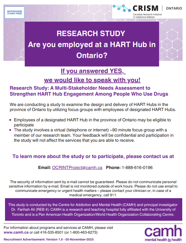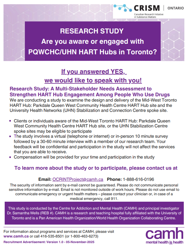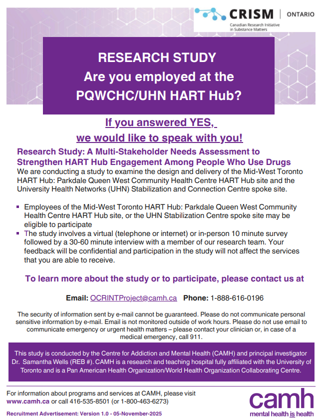 The Ontario CRISM Node (OCRINT) often recruits participants for research studies to help us better understand and improve health services for people who use drugs. This page highlights the active studies we are currently recruiting for. If you’re interested in participating or learning more, please contact us at: